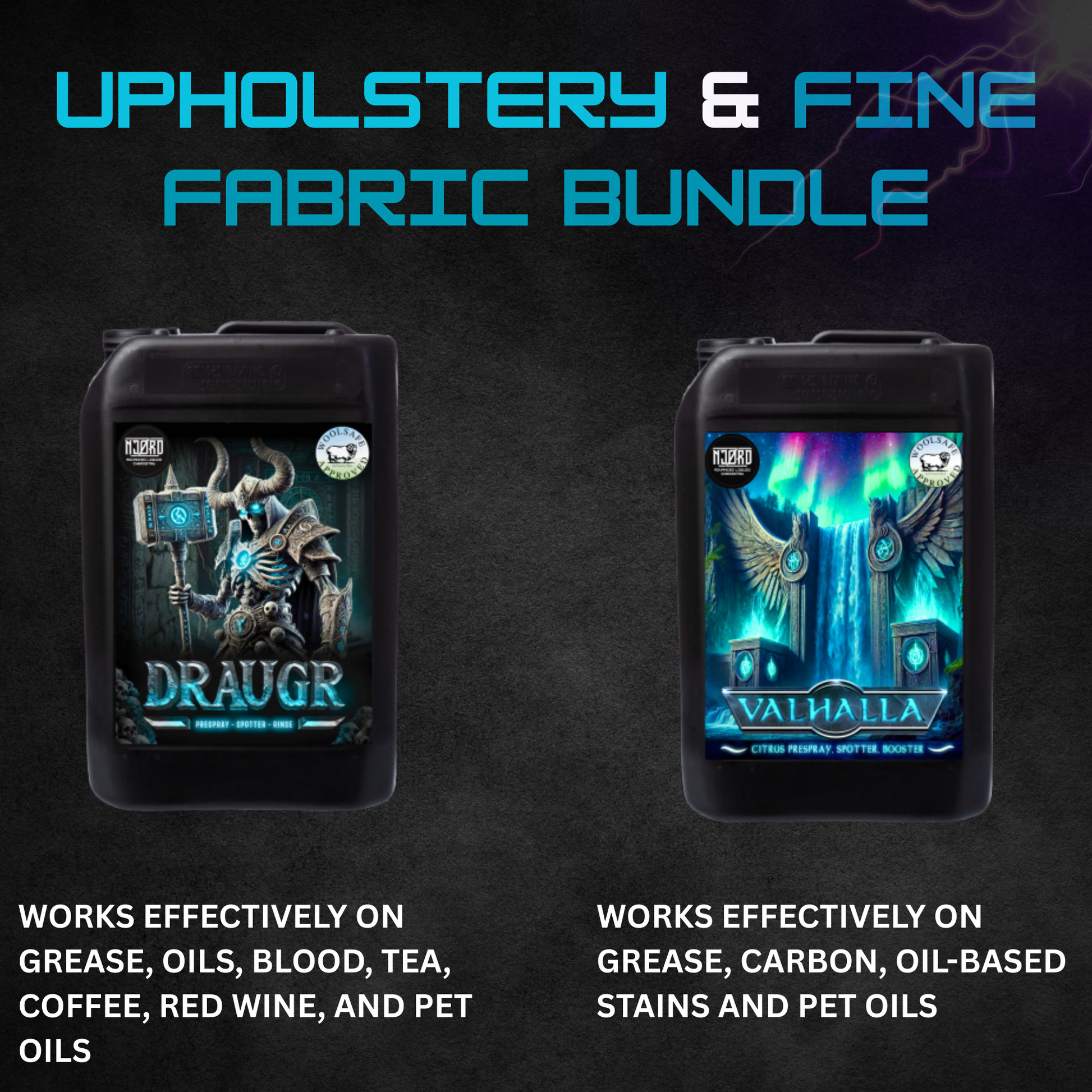 The NJORD Upholstery Cleaning Bundle combines VALHALLA WoolSafe Solvent Pre-Spray with DRAUGR Enzyme Pre-Spray to create a complete, fibre-safe upholstery and fine fabric cleaning system.